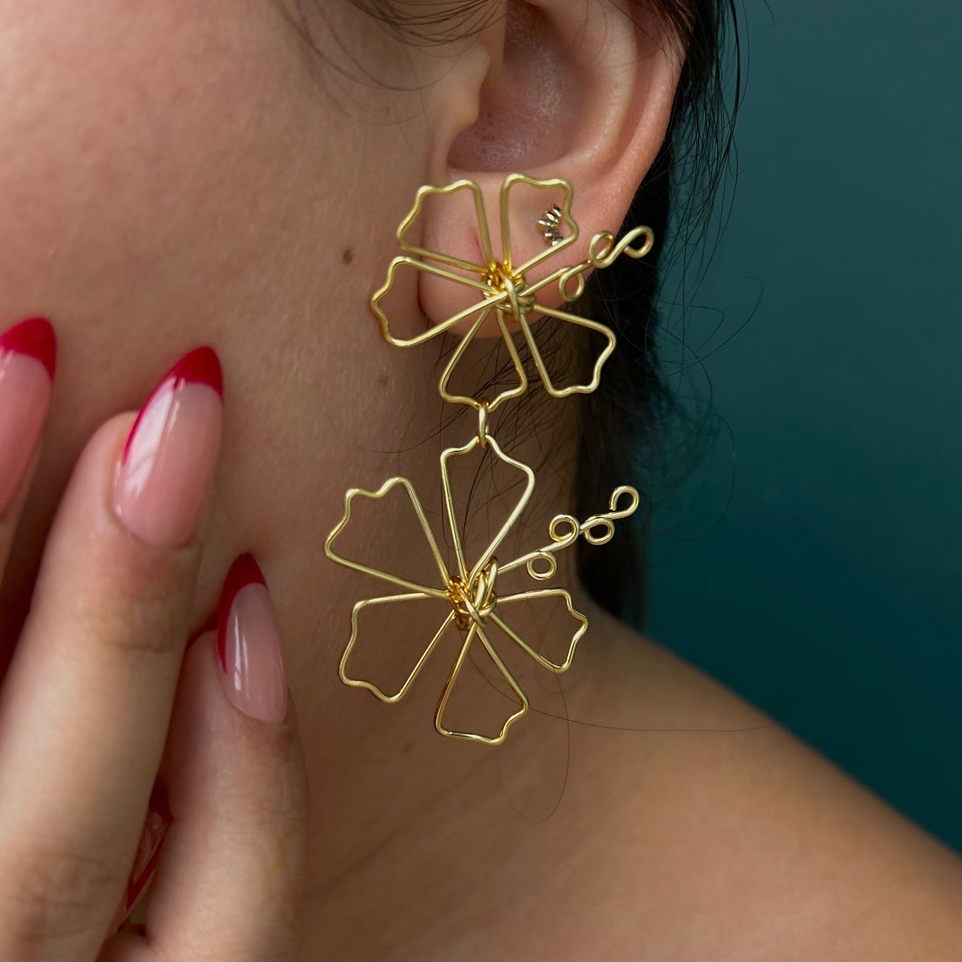 Dangling earrings with hand-wired maga flowers. A living piece of craftsmanship inspired by Puerto Rico’s national flower.