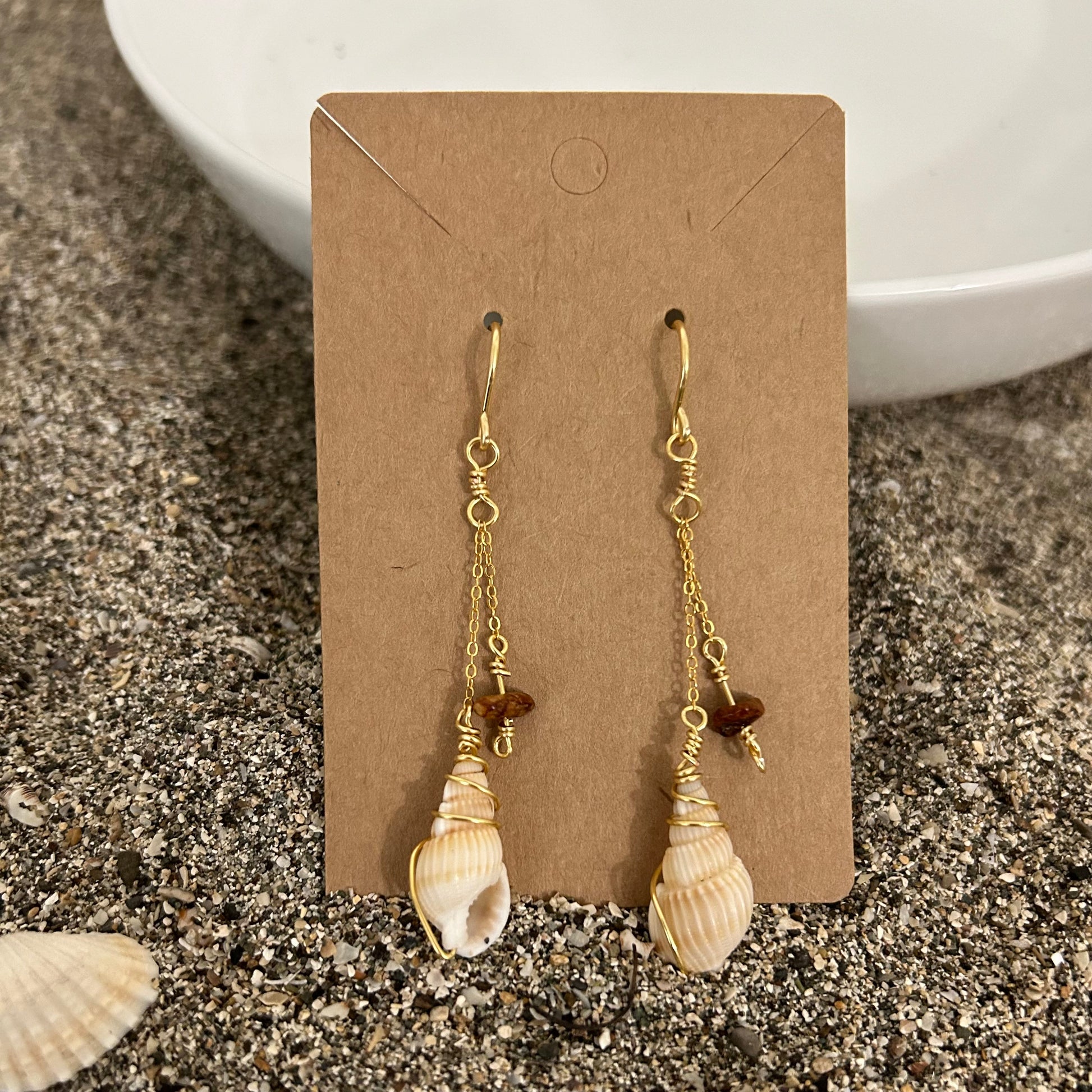 Long earrings with natural shell and amber quartz. A warm, beachy piece that captures the essence of summer.