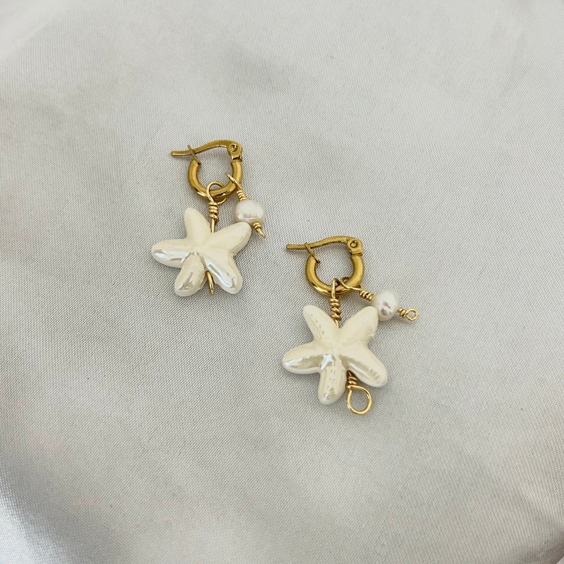 Inspiradas en el mar y la frescura del verano. Estrella de mar en cerámica y perla colgando de argollas en stainless steel.